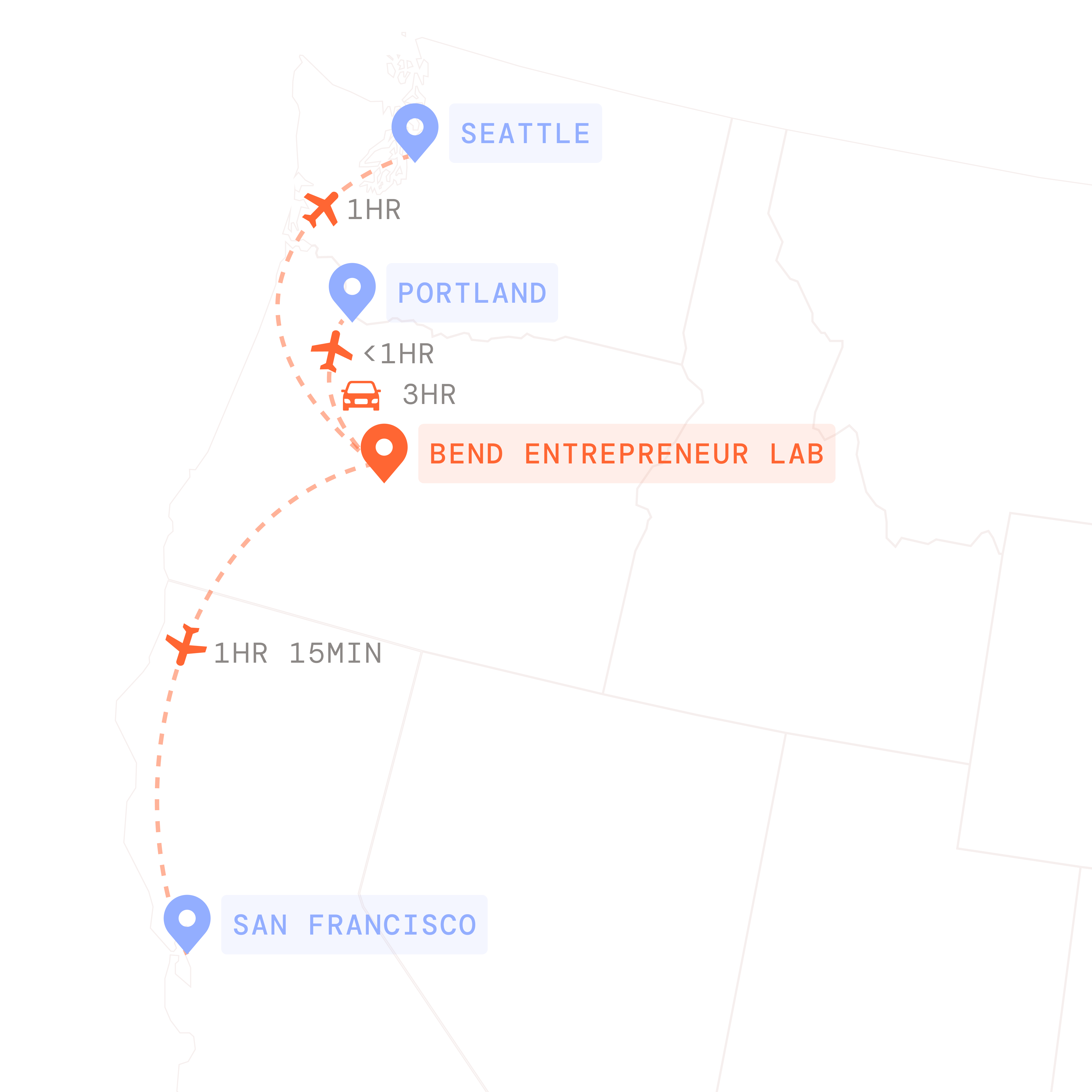 Bend is centrally located on the West Coast Corridor, between the major entrepreneurial hubs of San Francisco and Seattle. It’s an easy direct flight to either destination, or a few hours of beautiful driving through the Cascade Mountains to get over to Portland. Bend offers the “best of both worlds”– an incredible location known for its outdoor adventure lifestyle, only a quick flight away from major cities.